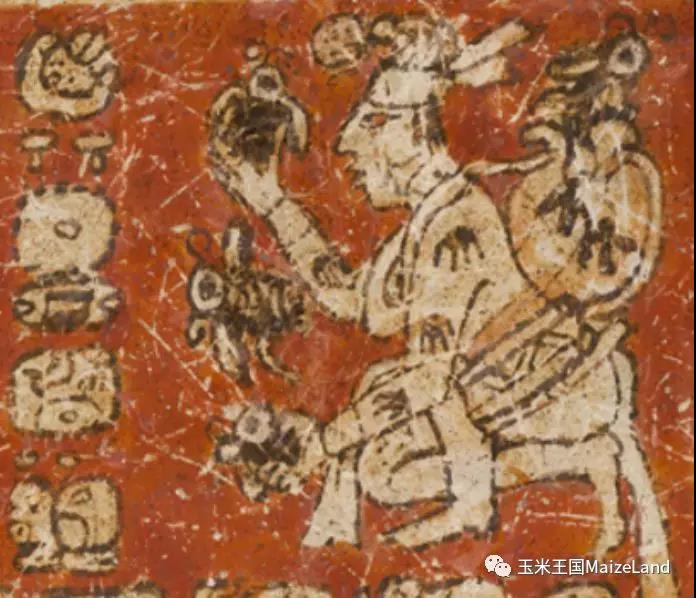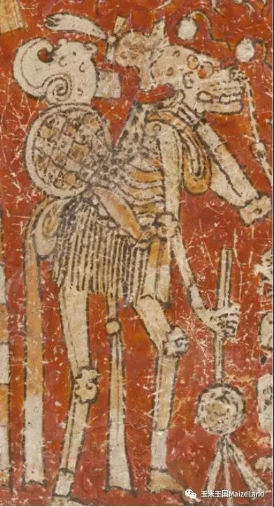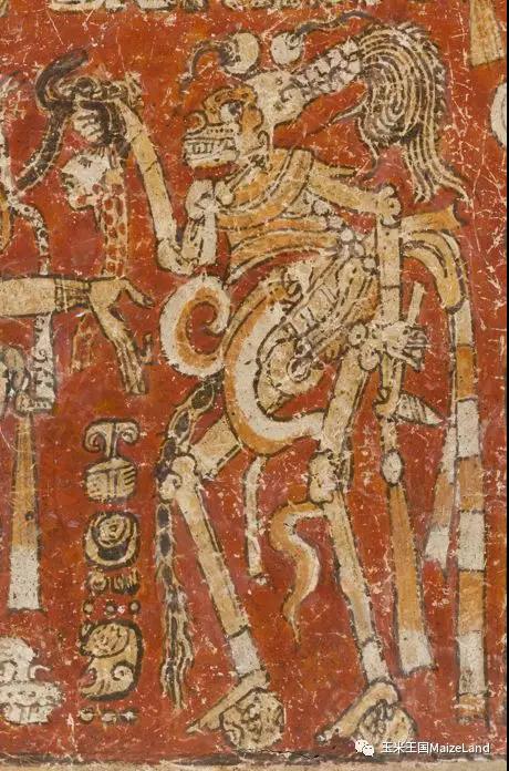 左侧死神为典型的骷髅之身,脚下踏两块圆石(死神脚下常会踩不同的东西)。头顶的两枚人眼球装饰,额头的霉点,张开的腹腔中散发出的腐臭之气都是死神标志。他左手持一带柄黑曜石刀,右手举起一颗新鲜割下的滴血头颅,献给左侧玉米神。