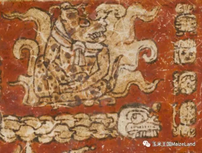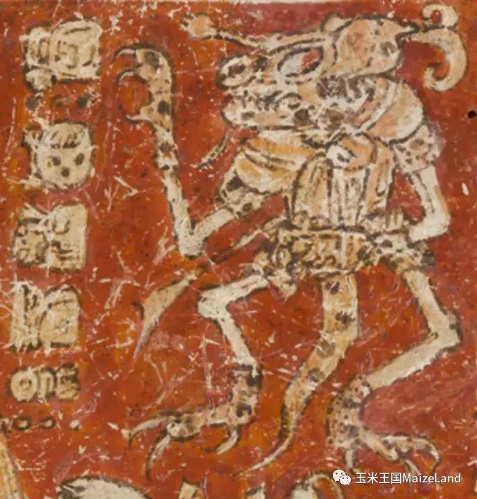 第二位是火焰美洲豹,右侧的第一字为火焰,第二字是美洲豹的写法之一HIX(读音近似“亦是”)。与它对应的右数第二位也是一只美洲豹,舞动着夸张的利爪,左侧第二字也是像有刘海儿的娃娃头一样的HIX。这两只猛兽让人想起《波波乌》中记载的冥界险境之一“美洲豹之屋”。