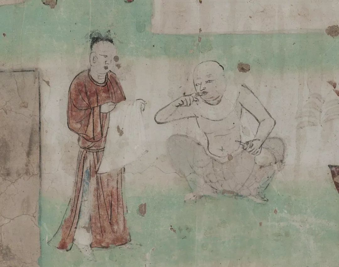 但是我们莫高窟的壁画里头,不是光高大上的,也有生活细节的,生老病死、婚丧嫁娶、衣食住行、通通都画。这个刷牙图,这个什么时候,相当于公元八世纪末,中唐的时候,就是说一千多年前,我们的古人,已经知道牙齿要讲卫生了,这还是有意思的吧。