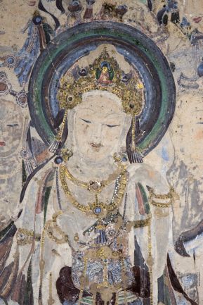 下面讲讲壁画之美,我想先说说,57窟一个美人菩萨,那么到底怎么美。它时代相当于初唐,这个菩萨身材修长,微微的有点S型的身躯,为什么?