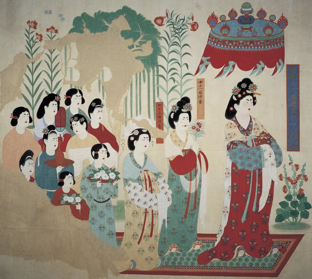 这个,咱们看第二个姑娘,叫女十三娘。头上戴着凤冠,头发上插着步摇,就是可以摇晃的一个装饰品,脸上贴着花,叫花钿,然后穿着半截袖的半臂,体态丰满,衣着华丽,她的气质是非常雍容华贵,是不是这个。