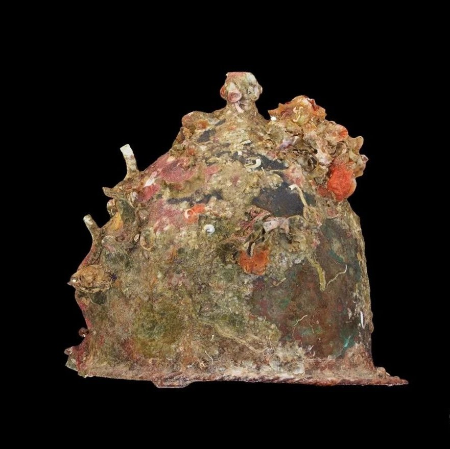 考古学家在“罗马—迦太基海战遗址考察”中发现多件头盔。图中展示的是其中一件头盔的3D模型,由威廉姆·M·莫瑞制作。版权:RPM航海基金会
