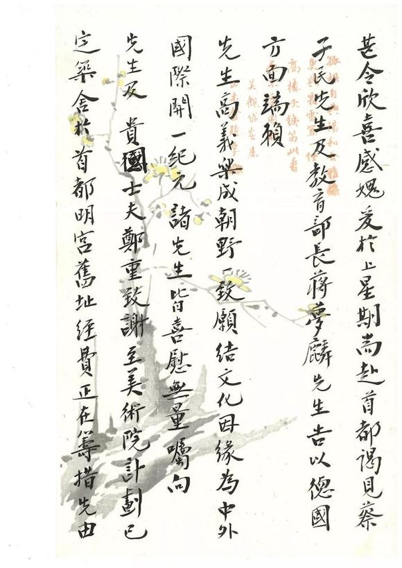 希圣先生有道,佛府别后即由马赛迳抵印度,访泰谷尔先生于圣地,小住八朝,备承渥遇,又登喜马拉雅大山,风云壮丽,甚发遐思,归途游缅甸、南洋,亦广闻见。抵沪以来,已逾半月,接奉惠简,欣知先生鼎力为此方美术院计划进行,得蒙贵国舆情及诸大博物院、诸大印铸所慨允襄助,甚令欣喜感愧。爰于上星期耑赴首都,谒见蔡孑民先生及教育部长蒋梦麟先生,告以德国方面端赖先生高义乐成,朝野一致,愿结文化因缘,为中外国际开一纪元。诸先生皆喜慰无量,嘱向先生及贵国士夫郑重致谢。至美术院计划,已定筑舍于首都明宫旧址,经费正在筹措,先由中央研究院于三月内指拨华币五千元(合德币一万马克),即烦先生会同贵国美术专家,代为选购名画印品,邮寄来华。明年二三月间,此方有美术展览大会(设在上海),贵国美术院或私人画家设有惠赐珍件及可借用者,并希连同购品一起付寄。如能在于初春运到,即可与我方美术联合展览。自是盛会,想亦先生所乐闻也。至于初期代购画件一款,应由此间迳行汇去,或即以该款为贵方代选购中国美术作品以相交换,并请明示以便遵行。耑此鸣谢,敬颂
