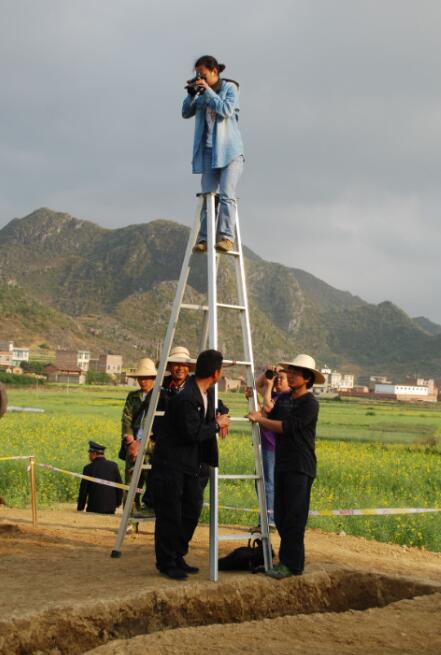 早期,受器材、环境的限制,为了拍一张遗址全景,我们需要渡江(因为大部分遗址都分布在江河两岸),背着器材爬上遗址对岸的山头,这样才能从高处拍摄一张遗址与周围环境现状的照片;若是在发掘范围内,需要对某一个遗迹单位或一组遗迹现象进行记录,可以借助附近的大树、楼房顶、台地等位置相对较高的地方;如果没有合适的高地,只能借助于人字梯,这样就能获得斜向俯拍的影像资料,虽然视角更广,却仍无法与正投影影像资料的效果相比。