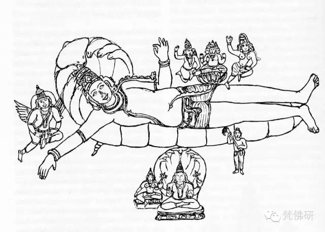 (梵天从毗湿奴肚脐上长出的一朵莲花中出生,线描图,引自《印度诸神的世界》)