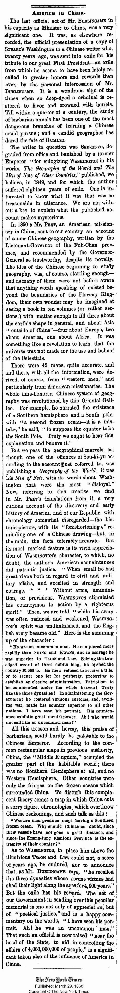 1868年3月29日,《纽约时报》报道了这场赠画仪式,并以大幅版面发表了评论文章,评价了徐继畬的治学勇气和他的复出。