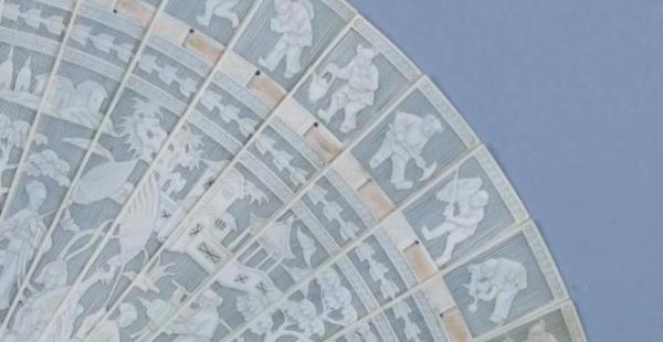 象牙劈丝透雕人物徽章纹折扇 清 东莞市博物馆藏(细节图)