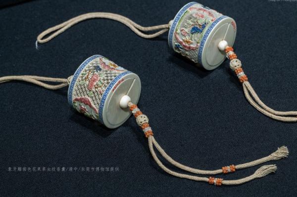 象牙雕茄色花果草虫纹香囊(清) 东莞市博物馆提供