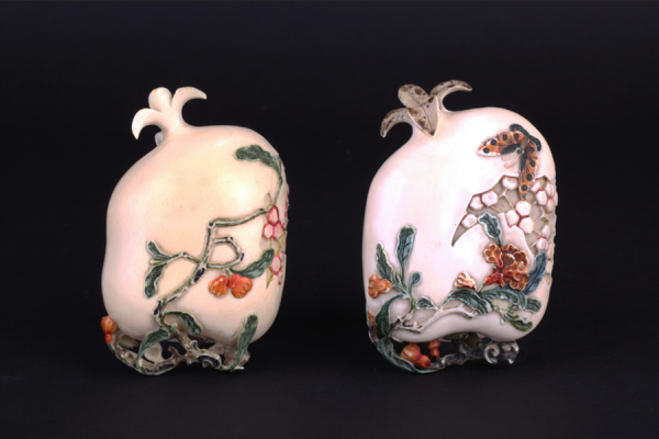 象牙雕茜色蝴蝶纹石榴形盖盒 清末 东莞市博物馆藏
