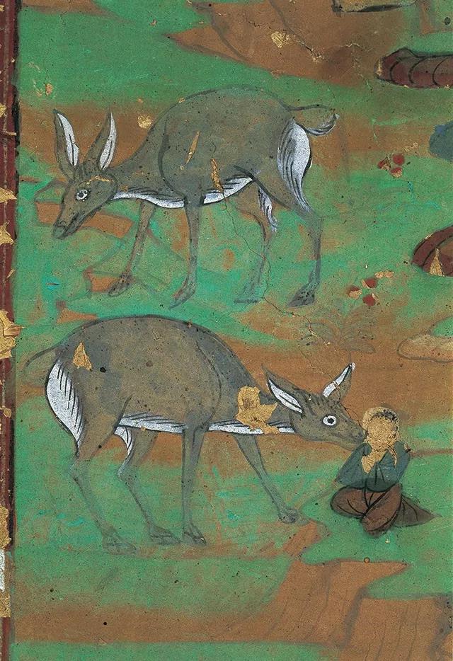 莫高窟第154窟所绘的鹿母夫人故事,表达了动物与人之间的别样深情——雌鹿产下女婴,并没有因为女婴不是同类而抛弃她,反而是以母性之爱舔舐着小女孩,眼神嘴角流露笑意,喜悦温暖之情跃然壁上,这就是母爱的伟大。