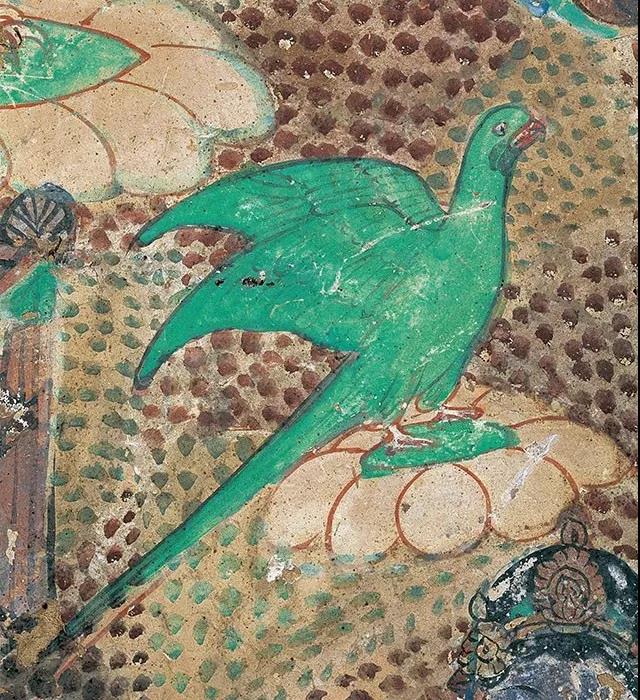自南朝开始,鹦鹉便被视为会带来吉祥的符瑞之鸟。鹦鹉因其羽毛色彩鲜艳如宝石,能学人言,深受人们的喜爱。在莫高窟北朝壁画中始有鹦鹉图像出现,但当时多作装饰为用。