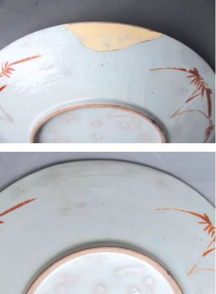 在古代,制作圆形器物时都是使用陶车拉坯成形,这就会在器物上留下拉坯形成的弦线,修复时要注意对拉坯弦线的模拟。如图一粉彩盘的口部有局部缺失,用胶填补打磨后,必须将中断的弦线再全部接上,外观才能浑然一体。