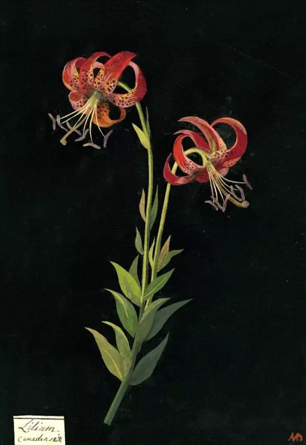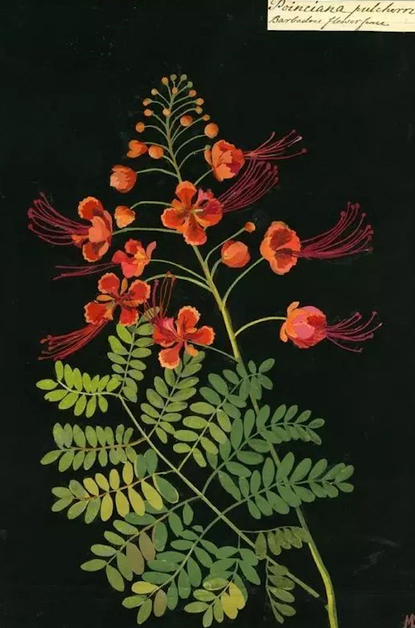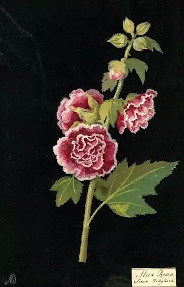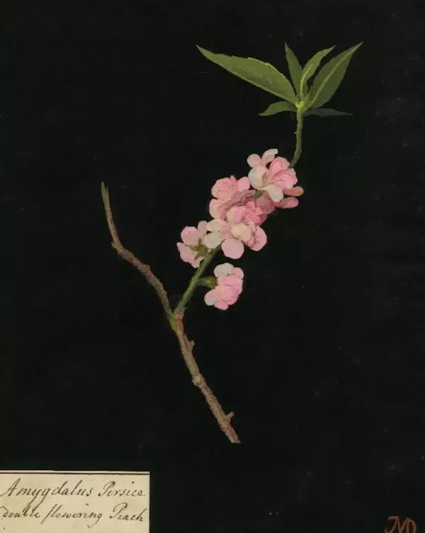 德拉尼的大部分作品还会标注植物的学名和俗称,以及制作的日期、地点以及植物的赠送人。在作品的右下角,你还可以发现剪纸做成的德拉尼名字缩写“MD”。