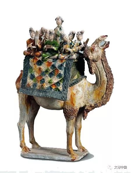 漫漫丝路充满艰辛,骆驼和马是人们首选的交通工具。从汉至唐出现了诸多以骆驼为题材的造型艺术品,栩栩如生地记录着丝绸之路上的贸易往来和文化交流。这尊三彩载乐骆驼俑,仅仅 41厘米长的骆驼上雕刻出八个鲜活的人物形象。骆驼引颈长嘶,驼背上铺着色彩斑斓的毛毯,上有八名乐手。其中七名男乐手身着汉服,手持从西域传入的乐器,面朝外盘坐演奏,中间有一站立女子正在歌唱,显然是一个流动演出团。