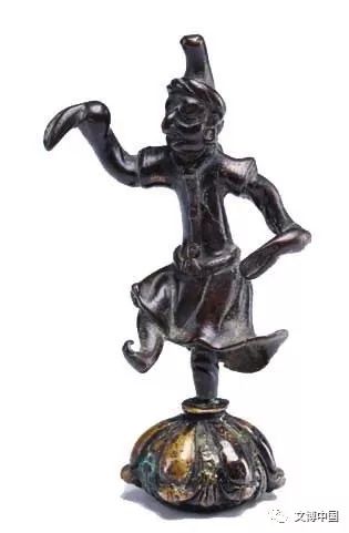 胡腾舞是从西域传入中原的一种男子独舞,是西域各族文化乃至西亚文化与中原文化共同孕育的艺术。经过不断的融合和提炼,胡腾舞受到河西各族人民的喜爱,很快风靡唐都长安并被引入宫庭,成为宫庭乐舞。这件高13.7厘米的陶俑,俨然一位动作雄健迅急、刚毅奔放,又柔软潇洒、诙谐有趣的舞者,呼之欲出。