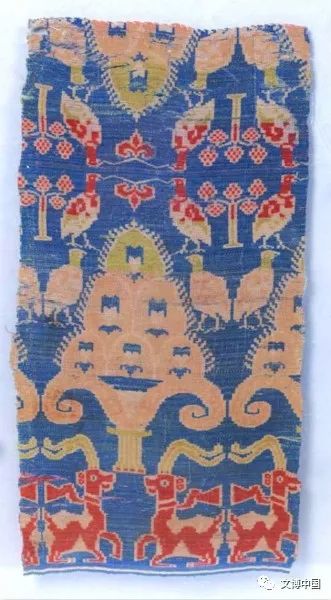 这件颇具异域艺术风的唐代丝织品出土于吐鲁番神秘的阿斯塔那古墓,不仅“羊”入画,还有大灯树。纹锦以黄、红、蓝、白四种颜色显花,主体花纹为中间的一列灯树,灯树的上方是葡萄树和对鸡,下方是对跪的大角羊。羊的颈部系着绶带,一对长角夸张地向后弯曲。灯树呈塔形,树上挂着花灯,树的边缘织出放射线,寓意夜晚树上的花灯放出耀眼的光芒。