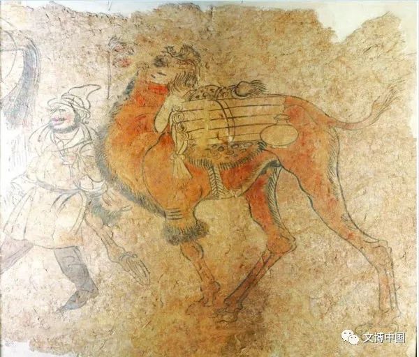 随着丝绸之路上经济、文化交流的繁盛,唐代出现了大量以“胡人”形象为蓝本制作的陶俑和画像砖。这幅2米见方的壁画,绘制在唐睿宗李旦被废做安国相王时其妾唐氏的墓中。壁画正中为一匹高大雄健的载物骆驼,前面牵着缰绳的胡人高鼻梁、深眼窝、络腮胡、唇红齿白,头戴高尖番帽,身穿翻领衣袍、小袖细衫,脚蹬尖勾鞋头,正迈步前行。一千多年前,各国商人云集洛阳,将一捆捆生丝和一匹匹绸缎,用麻布和皮革包裹,装上骆驼,浩浩荡荡西行的场景仿佛就在眼前。