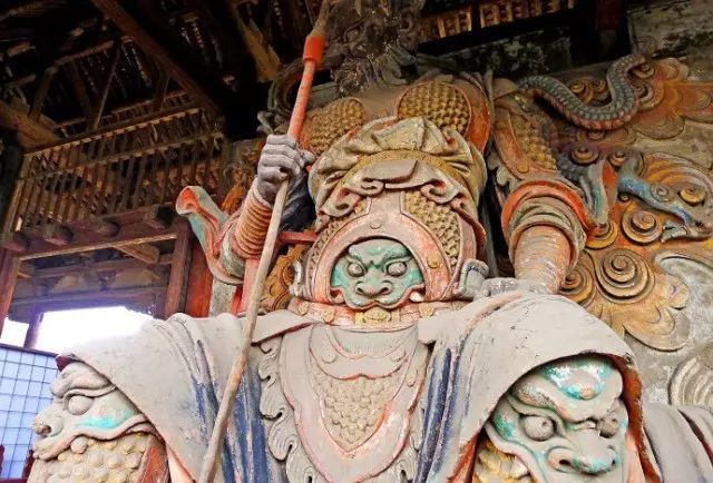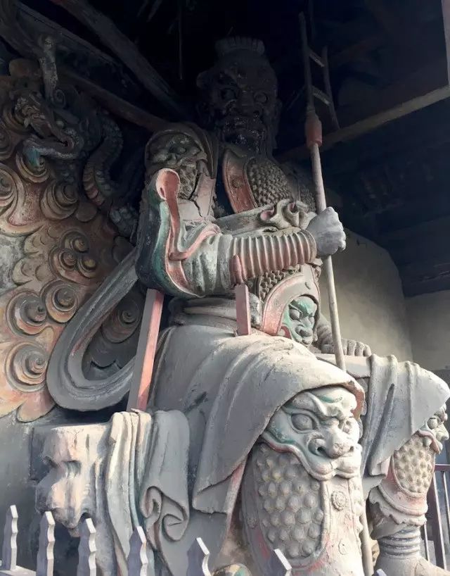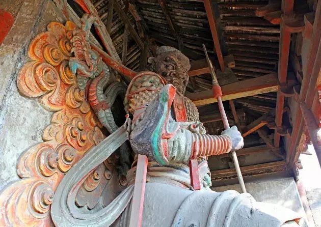清虚观主体建筑-纯阳宫 全观共有十座建筑,前后三进院落,在中轴线上有牌楼、山门、龙虎殿、三清殿、纯阳宫、玉皇殿。观院门牌楼,竖于两柱,并由八字形叉柱稳固,上有乾隆三十六年题"清虚仙迹"的匾额。龙虎殿、三清殿均为元代修建、明代重修,龙虎殿面宽五间,进深六椽,采用"悬梁吊柱"的奇特结构,殿下面东西廊分塑青龙、白虎二神像,高达5米,骨骼雄健,怒目而视,手持戟剑,神态勇猛,体态完好,为明代作品。