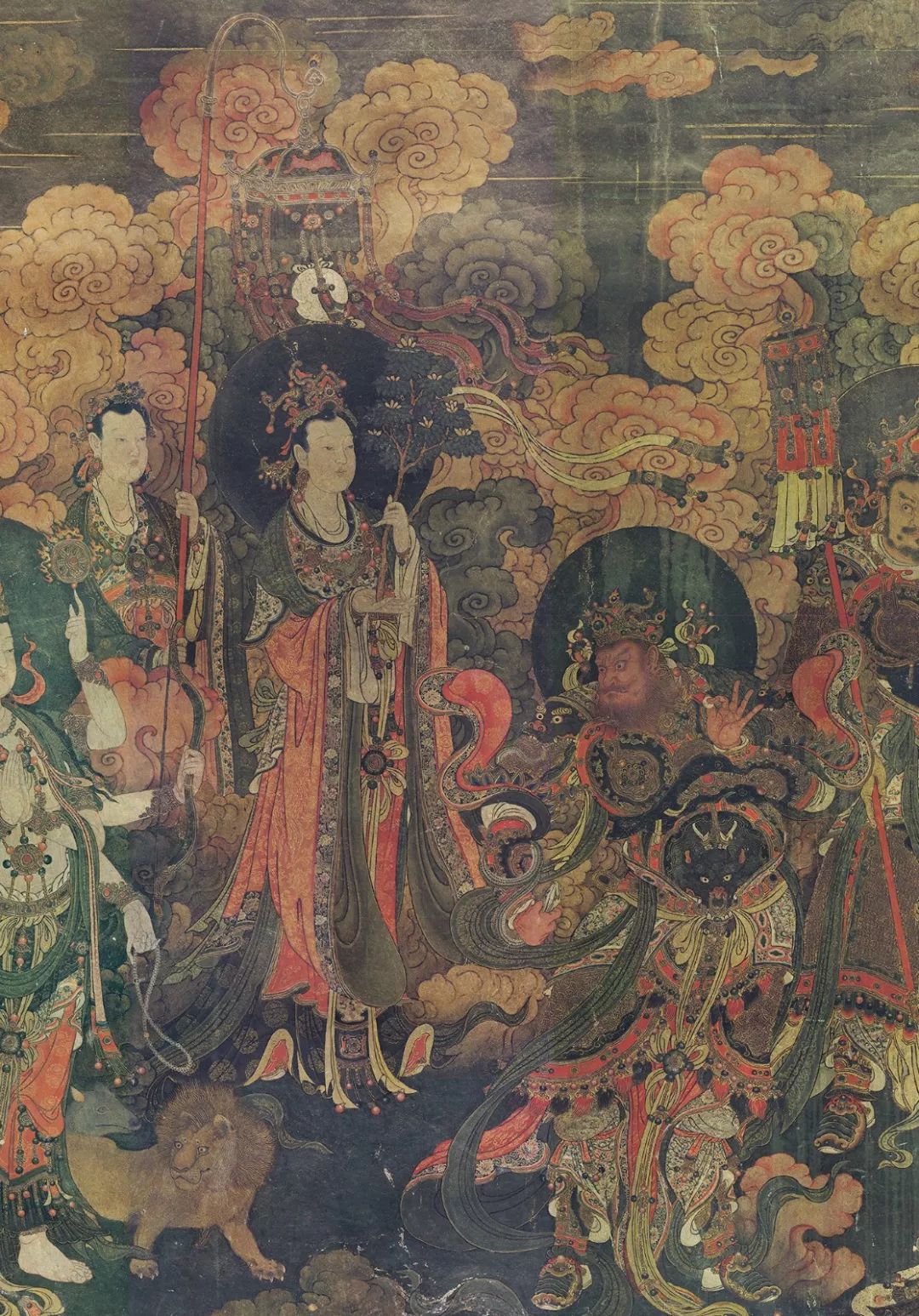 观音的四周还环侍着护法韦陀、白鹦鹉、善财童子和金毛犼,他们都面向观音,神情虔诚恭敬。韦陀左手行单掌礼,右手执护法神器,盔甲灿灿,飘带和彩云共舞,身姿飒飒。