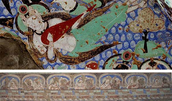 克孜尔石窟8窟前壁飞天 (上图),克孜尔38窟左右两侧壁《天宫伎乐》(下图)