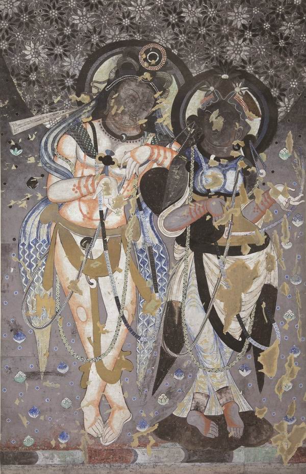 伎乐图每组两人,一男一女,肤色一棕一白,或左舞璎珞,右击掌;或左弹阮咸,右吹排箫;或左托花盘,右弹箜篌;或左击答腊鼓,右吹横笛;或左吹觱篥,右弹五弦琵琶……他们所奏的到底是哪一首古曲呢?《霓裳曲》《耶婆瑟鸡曲》,或是未可知的上天之乐?