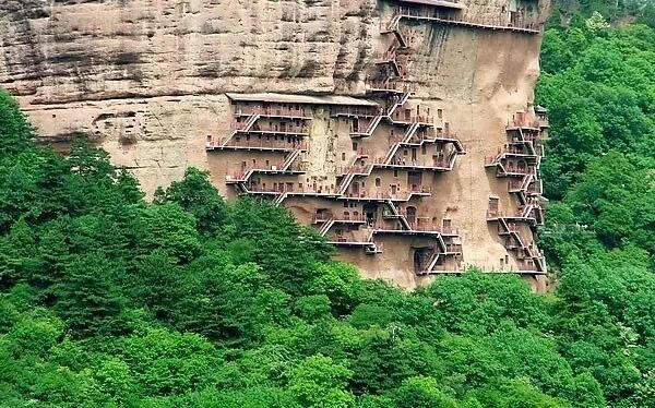 麦积山石窟,开凿在距地面80米的悬崖绝壁上,洞窟之间全靠架设在崖面上的凌空栈道通达,洞窟“密如蜂房”,栈道“凌空穿云”,其惊险陡峻为世罕见。