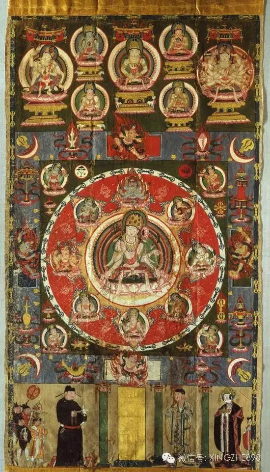 此图为十分稀有的密教十世纪绘画,全图分为上中下三段,上、中段属于金刚界曼荼罗图。