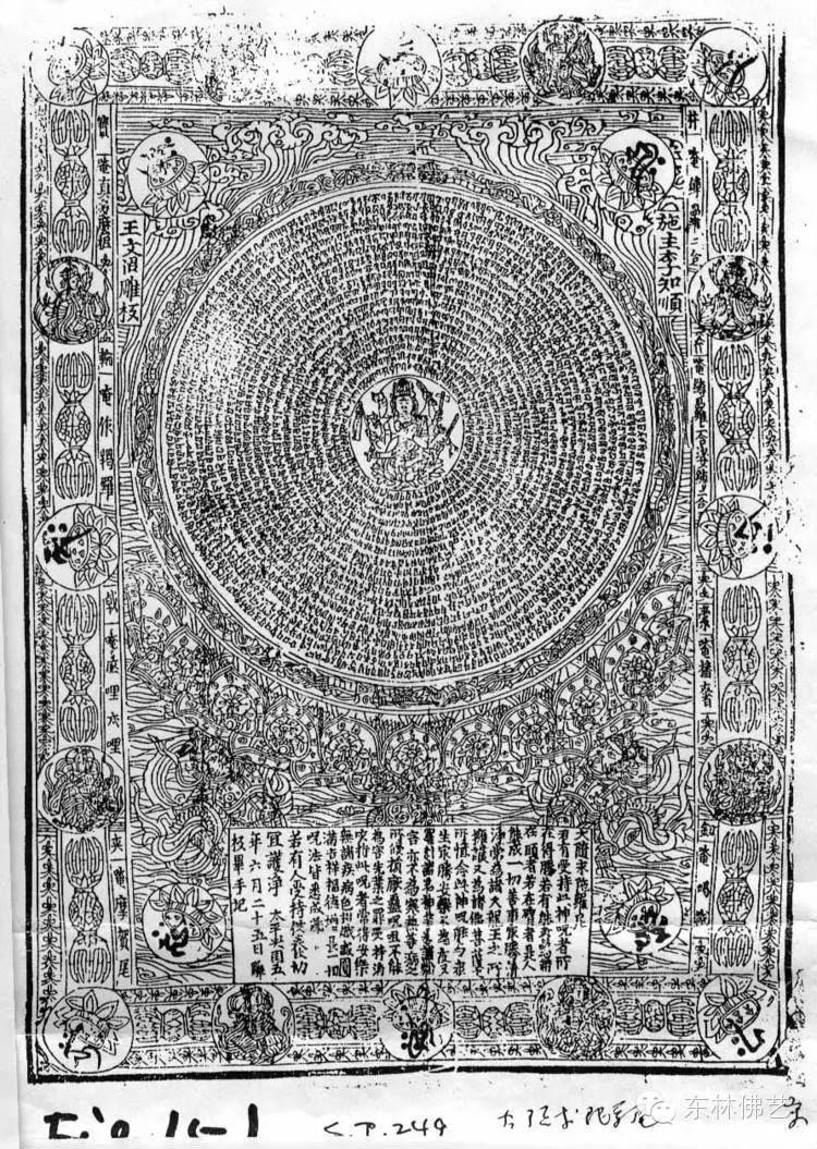 1幅,编号P.t.1。为内圆外方形图案。内城正中菩萨结跏趺坐,头戴宝冠,身着天衣,身处圆轮之中,周围排列七层梵文,四角点缀四朵莲花种子图案。中城为长方形,东西排列九层,南北排列十五层梵文咒语。外城东西两边上下各一天王,两两相向而立。天王头戴盔,身着铠甲,四天王手持之物不清。外城四边为结跏趺坐禅定千佛,著交领袈裟。千佛之间隔以三钴杵。四角及四边中间各一朵圆形莲蓬图案。下部有雕版发愿文31行,行1至3字。发愿文:“大佛顶/如来放/光明白/伞盖/悉怛多/钵怛囉/大佛顶/陀罗/尼/经云/佛告阿/难若/诸世界/一切众/生书/写此咒/身上带/持或/安宅/中一切/诸毒/所不/能害/十方如/来执/此咒心/成无上/觉/开宝四/年(971)十月二/十八日记。”