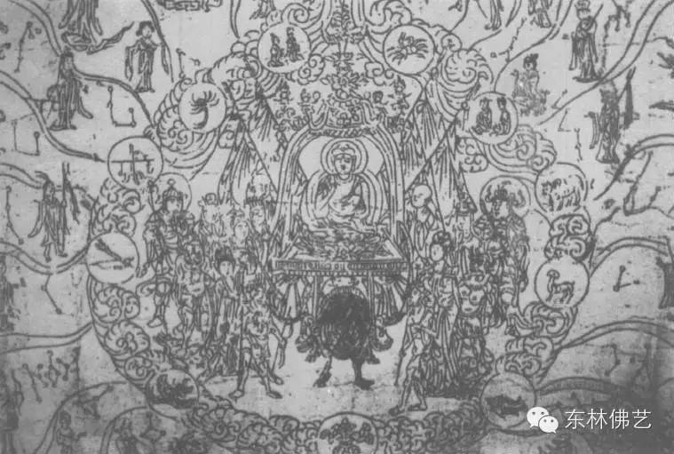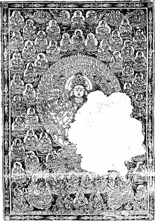 1幅,编号EO.1232。宽31.8厘米,高45.6厘米。中城阳刻。主尊千手千眼观音菩萨居火焰轮中,结跏趺坐莲台,头戴化佛冠。左下方残。右边12大手各持法器、宝物、莲花等。其余无数小手中均有一眼,层层排列。火焰轮外皆为阴刻。主尊上方正中有一佛二弟子说法图。佛端坐莲座,着袒右肩袈裟,结说法印。左右二弟子趺坐。主尊下方是伎乐舞蹈,围绕火焰轮是供养菩萨、伎乐。说法图上方一菩萨趺坐莲台,两侧二飞天乘祥云相向而飞,飞天旁是乘祥云赴法会的众天人。左右二角有瘦弱裸形的婆薮仙和雍容华贵的功德天。乐舞下方为四身供养菩萨,再下方为三身伎乐。两身处于火焰纹中的明王分立左右作伏魔状,头发上扬,怒目圆瞪,威风八面。下部两角二天王蹲坐。画边右题“弟子道照”,左题“雕刻印施”。外城四角各一法轮,四边为金刚杵图案边饰。主尊阳刻,中城和外城阴刻,主题突出,人物性格鲜明。虽人物众多,内容繁杂,在不同的雕刻手法组织下,却也排列有序,层次分明。(图7)