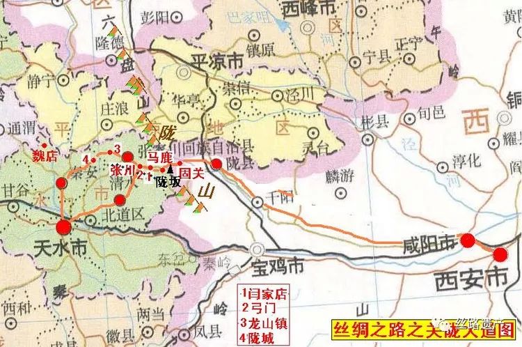 陇山是古丝绸之路西出长安所经过的第一道巍然屏障。正是在这条山岭上,由北向南依次分布着泾源、隆德、静宁、平凉、庄浪、秦安、清水等一些历史悠久的古镇和险关。古往今来,不管使者、官员、军队、商贾、僧侣、诗人,他们只有翻越了陇山,才能到达河西走廓,远走西域、中亚、西亚,实现伟大的理想和抱负。