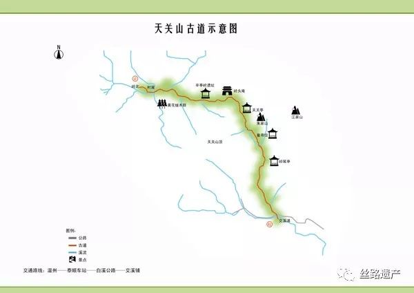 关山古道的北线,即秦家源古道,是关山古道最早的一条干道。这条干道的大致走向是从张家川县恭门镇经马鹿、羊肚子滩、秦家源至陇县固关。南线即咸宜关道。从陇县西行经咸宜村,在崖付沟口分途进沟,一路上行经马鞍子、骆驼巷、鬼门关至蔡子河,再经驿程沟至长宁驿,一路经碑志梁,出黑沟接南寨铺。中线即关陇大道。开辟于西汉初期,由固关、大震关、安戎关、付汗坪分岔上老爷岭,下山直通马鹿,再经恭门直指陇城,或由马鹿向南经长宁驿至清水、天水,从而形成了丝绸之路过境天水的南北两线。