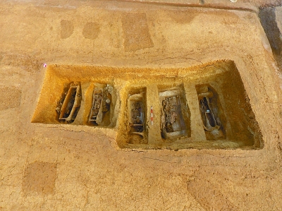 类似于这样的大型墓葬还有5座,面积都在10平方米以上,分布于墓地的不同位置,并且都是同穴双室合葬墓,墓室内常见体量巨大的棺木和丰厚的随葬品。通过对保存下来的人骨鉴定可知,这些大型墓葬的主人都是头朝城内,表现出了对生活场所的眷顾。在它们的周边,则分布有数量不等的中小型墓葬,头向不尽相同。不过,也似乎存在部分墓葬围绕大型墓葬分布的现象。它们之间的准确关系有待于古DNA信息的最终解读。