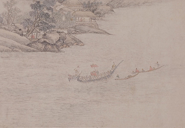 北京故宫还藏有一卷清代王概绘的《龙舟竞渡(卷)》,相比宫廷绘画的富丽精致,此卷以江河为主线,渐渐展开端午时节赛龙舟的场面。画面用笔工细,场面宏大。几艘龙舟昂首翘尾,动感十足。船上人小如蚁,但奋力划桨之势尽显。在构图上,运用大片留白表现水天一色和浩渺的江河,给人以开阔的视野。而江中点缀的渔家小船及岸上人们争相观看的情景,又使画卷平添了几许情趣。