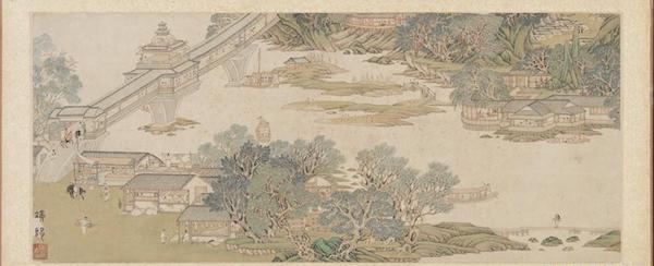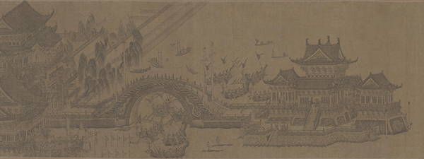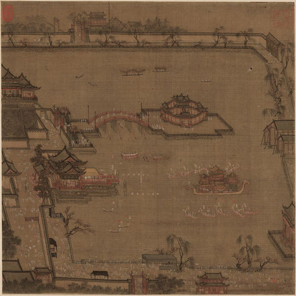 同样表达金明池龙舟竞渡海还有台北故宫博物院所藏的元代王振鹏的《龙池竞渡图》: