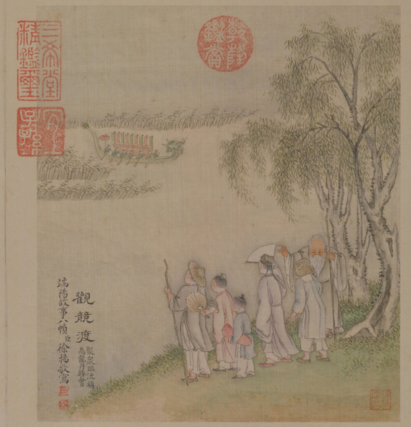 而对于端午的全景式描绘当属清代徐扬的《端阳故事图册》,此图册各开分别描绘了端阳节期间的重要民俗活动,集中表现了历代各地的风俗习惯。每开均以隶书题写画名,并以行书对画作加以注释,以便读者进一步理解画面内容。