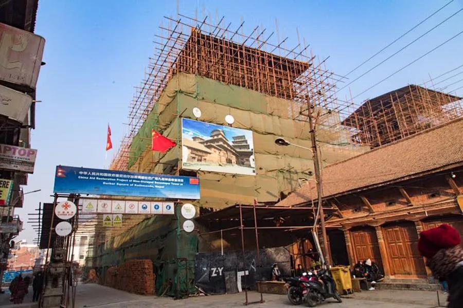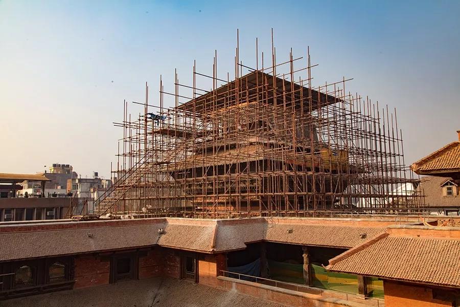 九层神庙位于加德满都市中心南部,它是马拉国王时期和随后沙阿王朝的旧王宫。近前是四处林立的脚手架和正在工作的当地工匠们,正门一侧树立的标示牌上介绍,现存建筑面积5600平方米,是尼泊尔唯一以佛塔形式为居住使用的建筑,庭院四角各建一塔,砖墙承重,木构披檐,木雕门窗十分精致,尤其是用于支撑披檐或屋顶的斜撑上刻满各式印度教神像,具有极高艺术价值和历史价值。从戴着安全帽的修复项目总管介绍中得知,2015年4月尼泊尔发生8.1级强烈地震,九层神庙建筑群遭到严重损坏,约有550平方米的局部建筑完全倒塌,大多数墙体产生变形和开裂,并伴随出现墙体渗水、基础沉降、排水不畅等问题。2017年11月应尼泊尔政府的请求,中国政府援九层神庙修复工作开始,预计明年竣工。