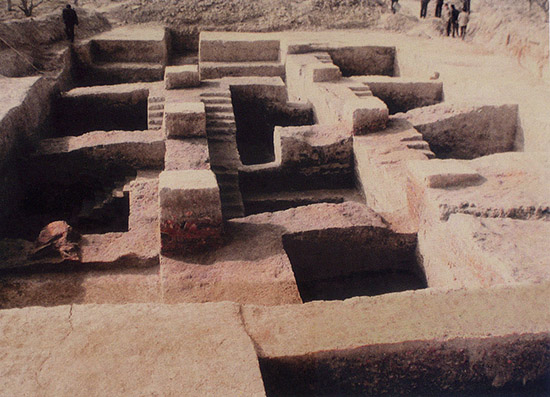 为了揭示这片沙土的真实面目,1992年9月至1993年7月,省考古所在长命印刷厂扩建区进行了考古发掘,揭露面积共计1400平方米。发掘领队是王明达,由杨楠实际主持,我参与了发掘。果然,发掘范围内全部发现有厚厚的沙土。经过仔细操作,判断沙土由两部分组成:上部为厚约30厘米的坚硬纯沙土,即当地村民曾挖取卖钱的沙土;下部为厚约50厘米的夯土,由一层沙一层泥间隔夯成,这部分因掺杂纯细的黏土,沙土质量不好所以无人采挖。我们认为,这种大范围明显有人工夯筑特征的沙土,一定是十分重要的建筑基址。