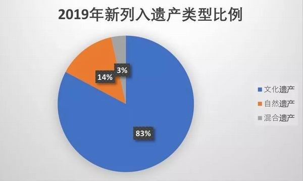 在2019年新列入《世界遗产名录》的项目中有24项遗产,4项自然遗产,1项混合遗产。文化遗产数量远远超过自然遗产。在新列入项目的地区分布上,非洲列入1项,阿拉伯地区2项,亚太地区10项,欧洲和北美地区15项,拉美和加勒比地区1项。今年列入的项目在地区分布上极不平衡,欧洲和北美地区列入的项目超多其他所有地区列入的总和。这样的审议结果距离“建立有代表性、平衡性和可信性的世界遗产名录”的全球战略目标十分遥远。