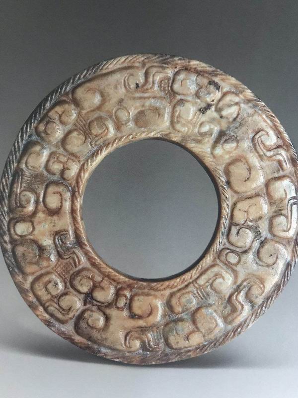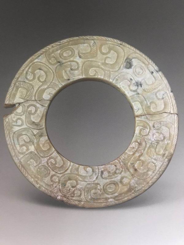 湖北省荆州市雨合狗子山M37出土,荆州博物馆蔵。外径37厘米,内径2厘米,厚0.5厘米,青白玉,肉断面为扁椭圆形,有38道组丝。