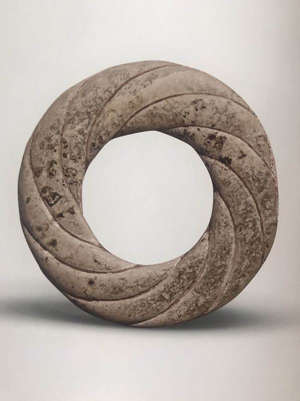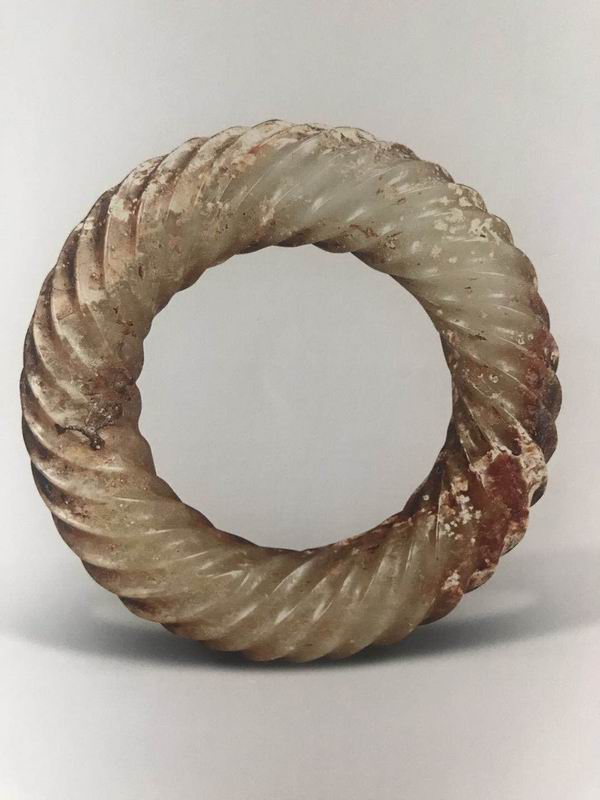 而由湖北省判州市雨台山M471出土、荆州博物馆藏的战国早期玉环(两件)与此件“绞丝玉环”也有相似之处。这两件青白玉环,二件属一对。有43道纽丝,二环横断面皆为扁椭圆形。