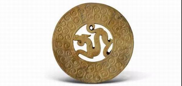 2000年出土于浙江省绍兴县平水镇中灶村,现藏于浙江省绍兴市柯桥区博物馆。整体造型十分罕见与别致,孔壁内径里还透雕着一条龙,张口圆目,蜿蜒屈曲,加上龙身周围环绕着的浮云,看上去好像在腾云驾雾一般,栩栩如生。