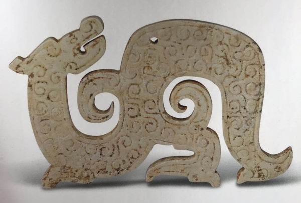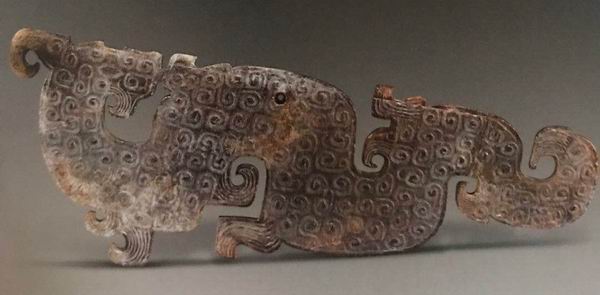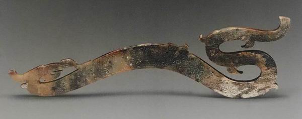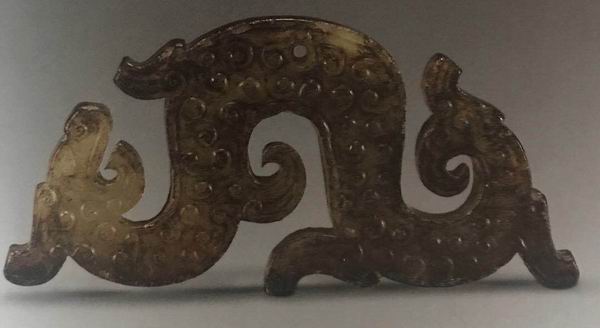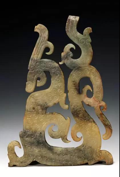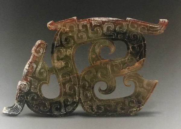 熊家冢墓地南殉墓出土,现藏于荆州博物馆。青白玉,边缘略残,两面有相同的纹饰。龙身呈现出一个U形,左边龙首曲颈,龙身装饰复杂,共有四只凤鸟与简化凤首,最为具象的得数右上部尾背倒立的凤鸟。龙身用不减地浅浮雕,雕刻出卷云纹、蝌蚪纹和谷纹;倒立的凤鸟颈圈上装饰有绹索纹,腹背有鳞状羽毛,尾部有三股长羽毛,腹部下方雕刻了足。