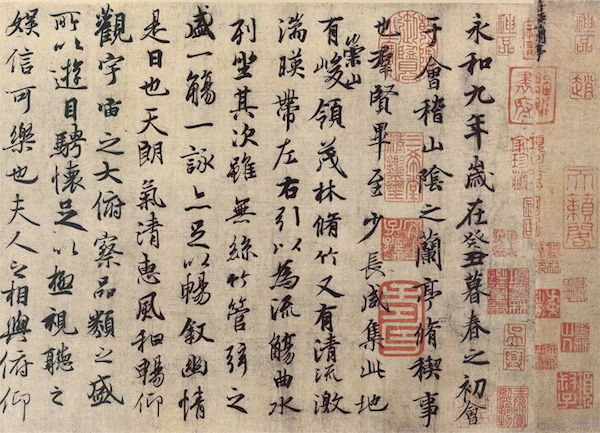 张芝以草书称圣。钟繇擅长铭石的隶书,抄写奏章的楷书,通尺牍的行书,“三法皆世人所善”,尤以楷书、行书著称。王羲之每每说自己“抗行”钟繇,表示不相上下,“雁行”张芝,是承认自己后于张芝,但羲之又说:“张芝临池学书,池水尽黑,使人耽之若是,未必后之。”王羲之这样攀比“钟张”,看似分别相比,实是夸耀自己兼具两位书法巨子之长。羲之的争胜自夸之言,成为南朝人评说右军的依据,庾肩吾《书品》推崇右军“兼撮众法,备成一家”。