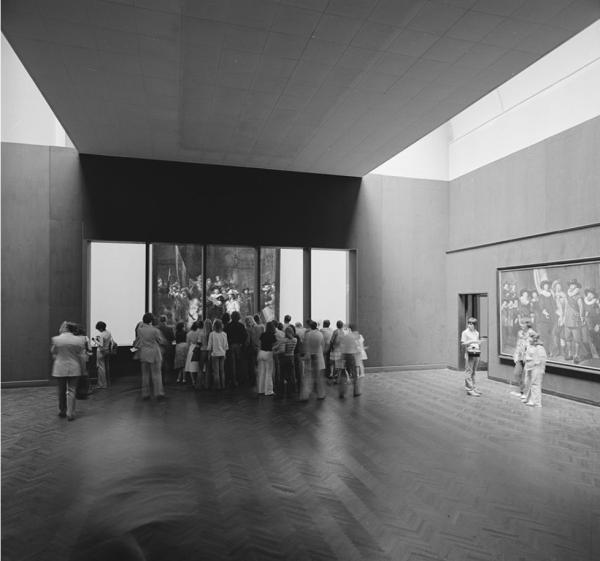 1975-1976年,游客们透过窗户观察《夜巡》的修复进度