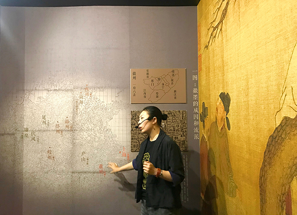 她带着观众走到了“徽墨的成因和流派”图前,“这里集合了不同历史时期的墨产区的变化,其中最广为后世所知的徽墨的产地就是徽州”,她指着图解释,“汉代隃糜、扶风、延洲,隋唐的易州、潞州、绛州、岐州都是松林资源丰富的地区。但因为几朝几代里烧烟制墨、兵连祸结对森林的消耗,优质松木资源殆尽,而歙县群山环绕,松木堪称上品,逐渐就成了新的制墨中心。”右上方的小图,则标注了徽墨三大流派的地域分布,摩古隽雅的歙墨、华丽精致的休宁墨,质朴无华的婺源墨,紧密地连在一起。