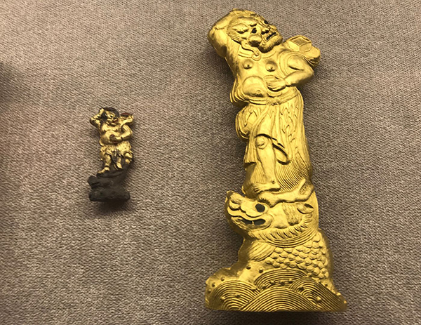 靠近楼梯的展柜里就放着一套套装饰美观的成套丛墨——集锦墨。其中惹人瞩目的就是“二十八星宿集锦墨”,一套一共二十八锭,一面雕刻二十八星宿图,一面绘制了传说中的列宿神将,墨面雕镂精细,神情逼真。
