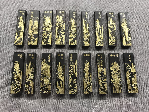 旁边就是十八锭墨宝组成的“黄山图集锦墨”,每锭墨正反面都刻有两景,展现了黄山的莲花峰、炼丹峰、天都峰、青莺峰等36峰的形态和气韵。
