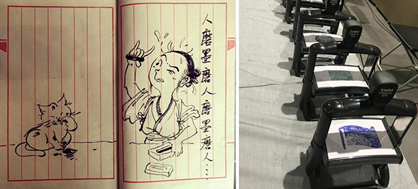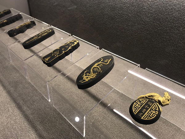 制墨家在40锭御园图集锦墨基础上后来发展出了一套64锭的版本,徐汇艺术馆的设计师就以此版集锦墨的拓片绘制了图像,还制作成了印章,供观众敲章留念。出口处的留言簿上能看到热心观众的生动感言。
