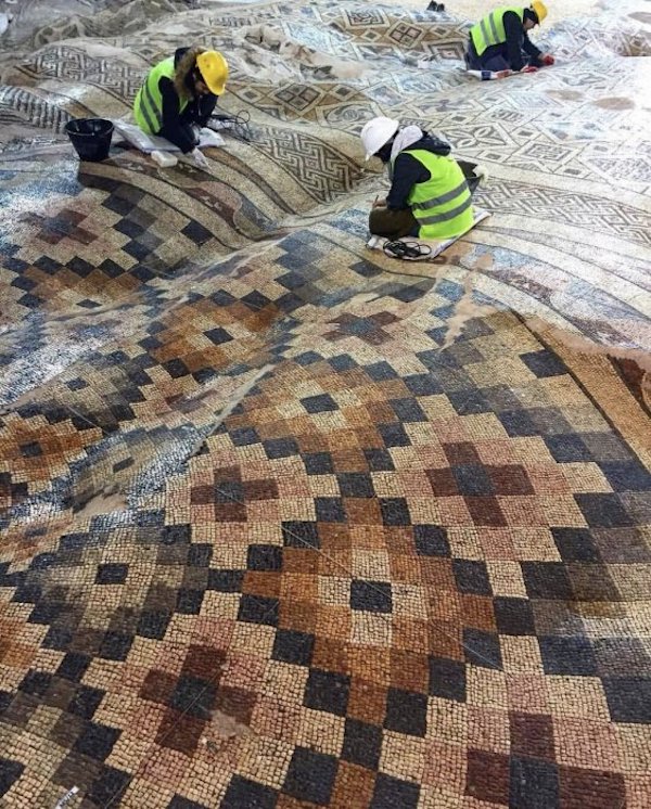 工人在巨大的马赛克“地毯”上发掘