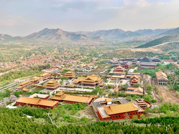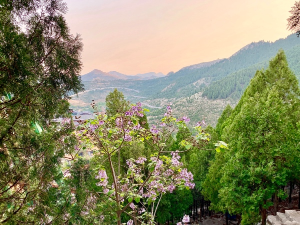 山高落日迟,下至半,有钟声响起,惊的山鸟四飞。走到一处阔朗平台向下望去,一片金碧辉煌,时鸟繁花,那儿正是龙兴寺了。